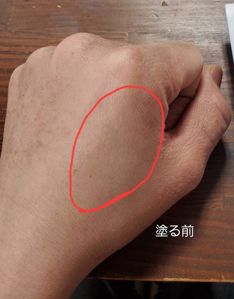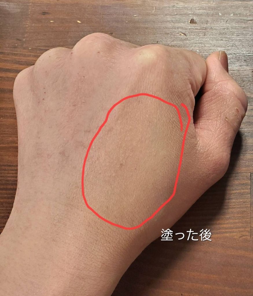 また、実際に赤丸部分に塗ってみるとファンデーションを塗りました。感はあまりなく自然な色味に。